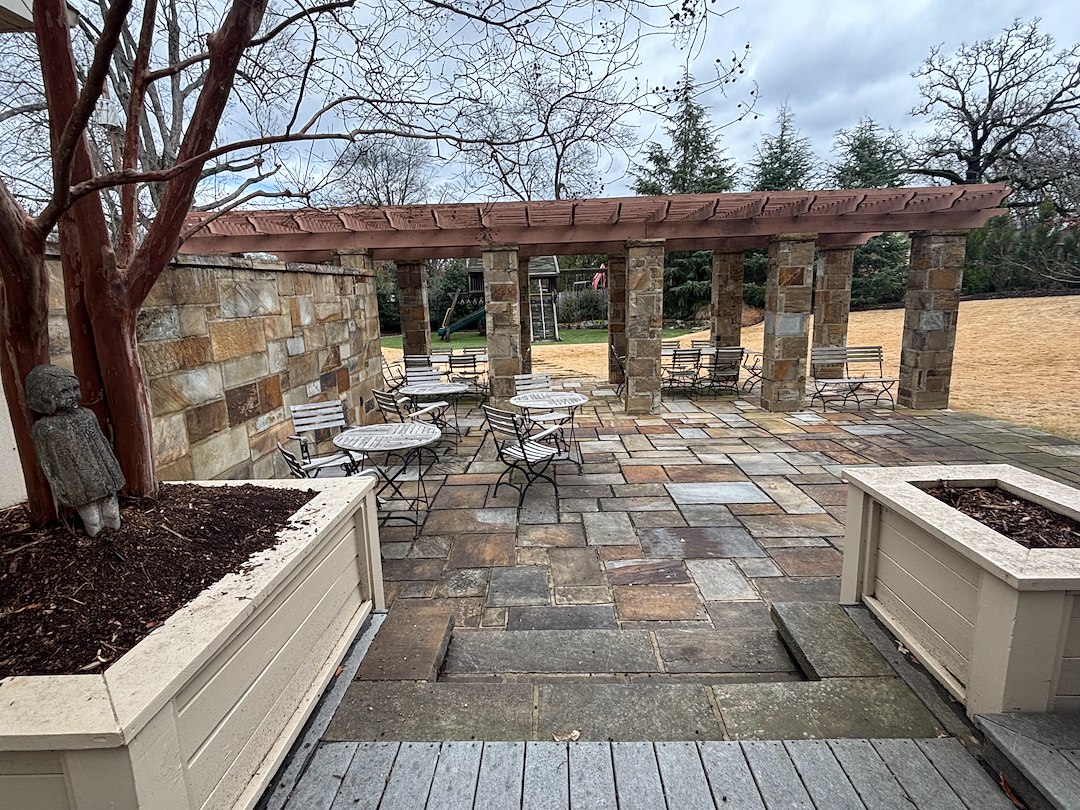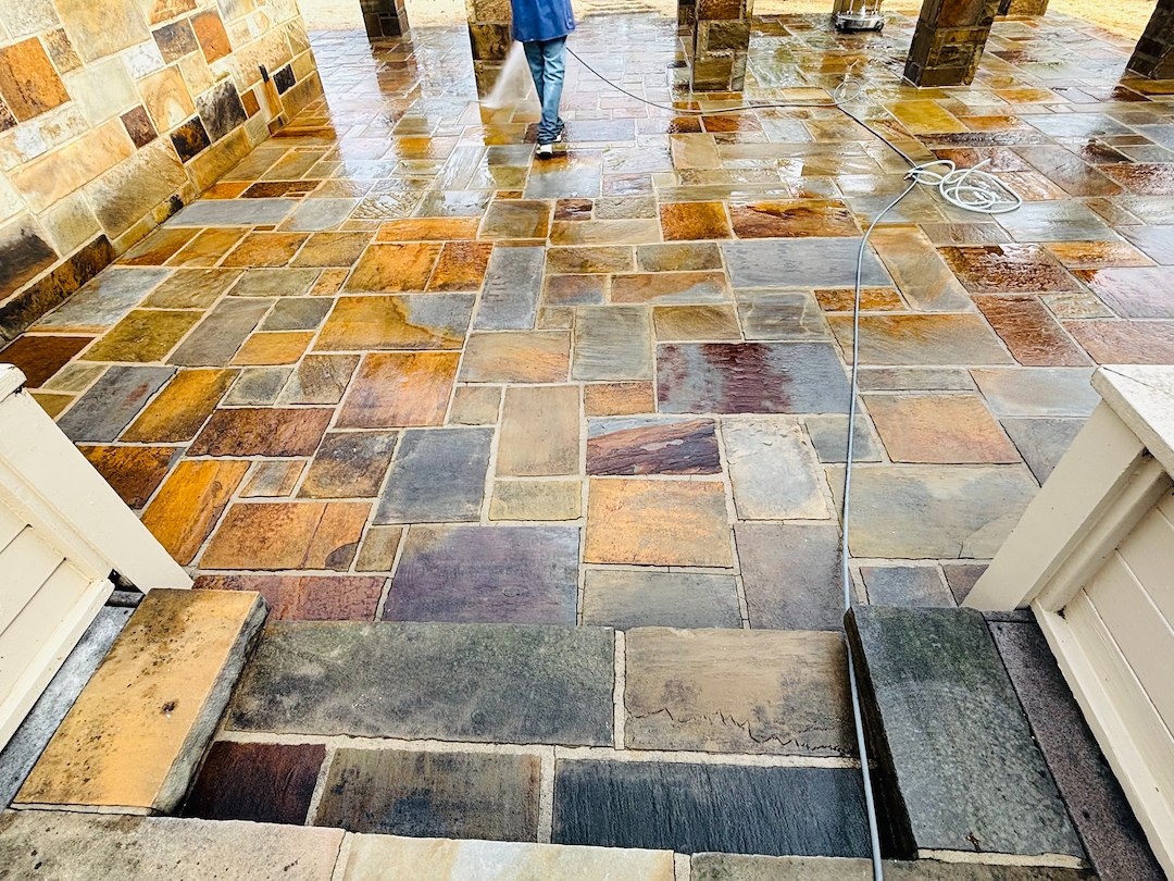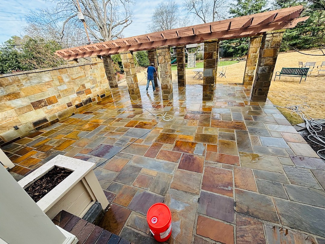 On the flagstone patio, we worked to remove dirt from between stones and to brighten the surface. Careful cleaning of the patio helps maintain a safe, usable outdoor space for the homeowner. The wood deck was also cleaned to remove dirt and surface debris so it is safer and more pleasant to use.